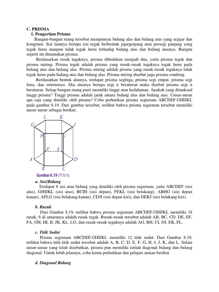 Rangkuman Ciri Dan Rumus Bangun Ruang Prisma Setiga Dan Prisma Segiempat Semua Halaman Bobo from asset-a.grid.id Bentuk alas dan atap prisma bersifat kongruen. Semua sisi tegak prisma berbentuk segi empat. Memiliki 6 buah sisi, empat diantaranya adalah sisi tegak. Alas dan sisi bagian atas berbentuk segiempat. Memiliki 5 buah sisi (n + 2 = 3 + 2 = 5). Bangun ruang prisma segitiga (sifat sifat) | kelas 5 sdподробнее. Prisma segitiga mempunyai 5 sisi, 3 sisi di samping yang bentuknya persegi panjang dan 2 sisi alas. Prisma segi lima adalah jenis prisma yang memiliki bentuk segi enam pada bagian alas dan atap juga memiliki selimut berbentuk persegi panjang di sisi sampingnnya.